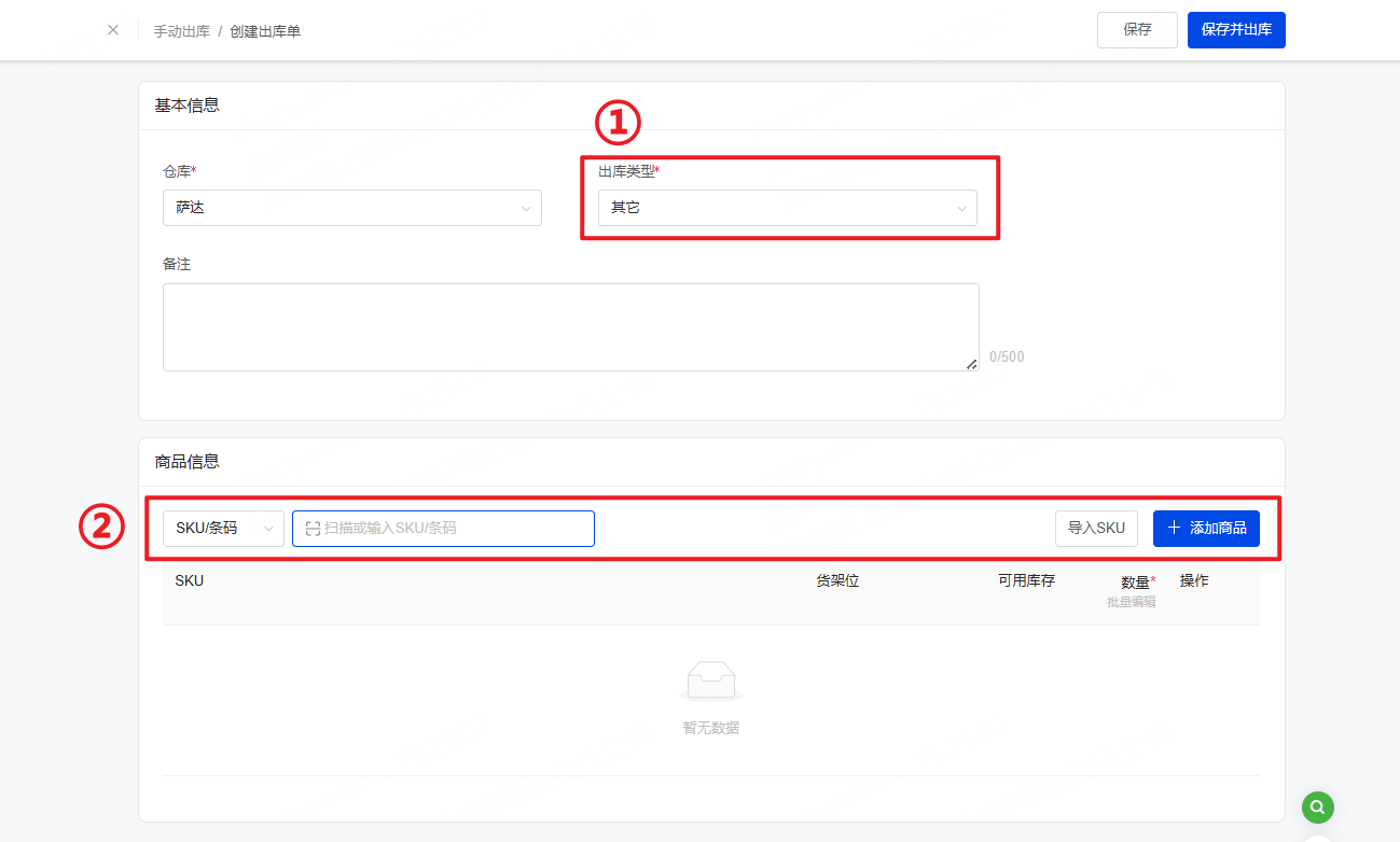 第二步:选择仓库,确认出库类型,添加对应的商品SKU,并填写出库数量