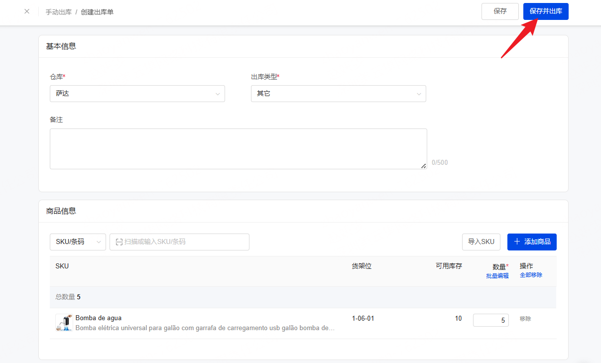 保存并出库:指出库单成功创建后,商品已成功出库,且出库单会进入【已出库】状态