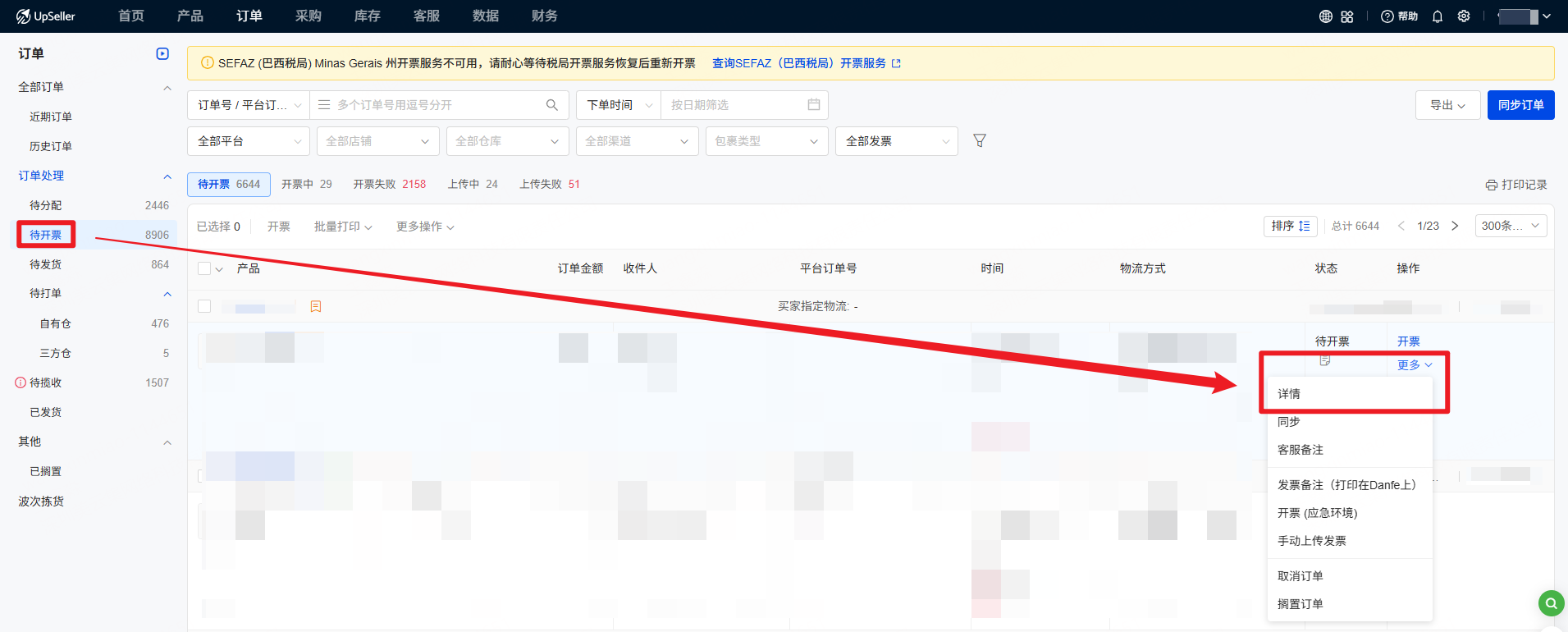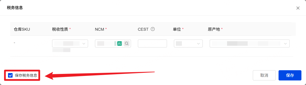 操作步骤: 1. 【订单】→ 点击【订单处理】 2. 在【待开票】状态的订单列表页找到对应的订单,点击【更多】→【详情】 3. 在订单详情页弹窗,点击【税务信息】 4. 填入正确的NCM,然后点击保存即可 注意:勾选保存税务信息的产品,勾选之后系统会保存此次的设置,之后此产品新产生的订单会默认为此次的更改选项,不需要重复更改NCM