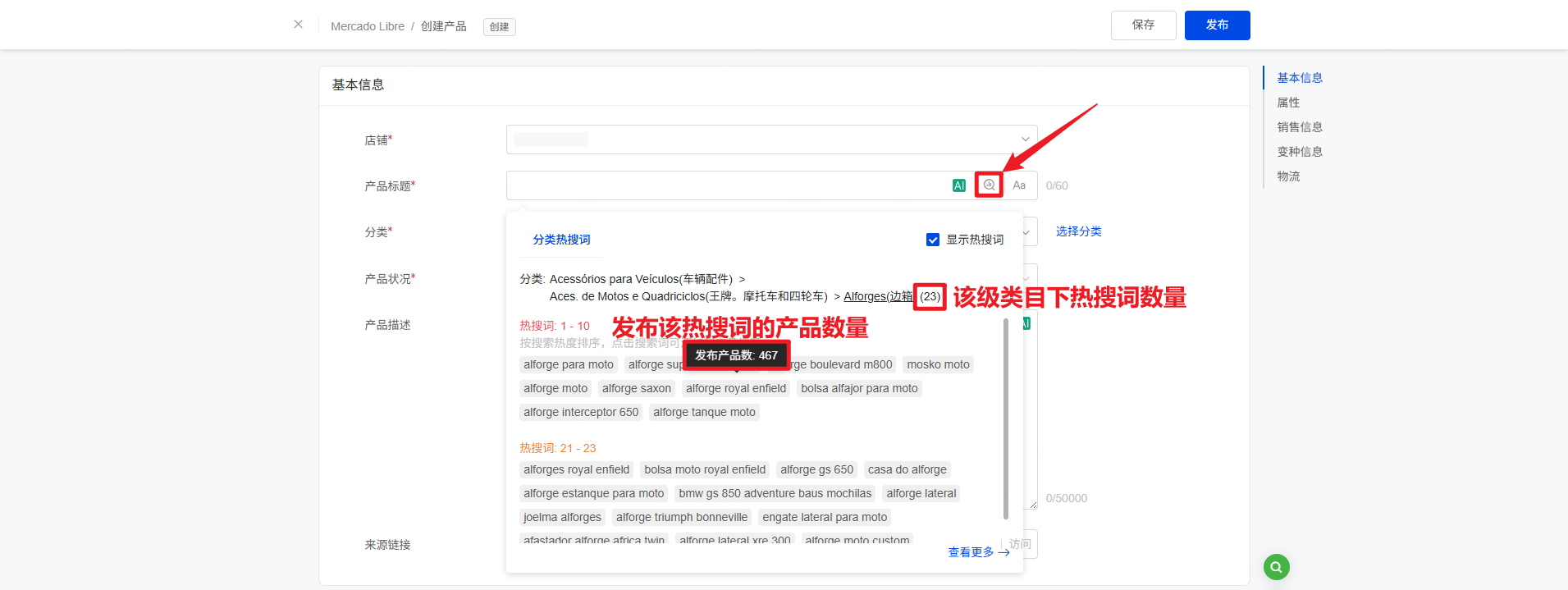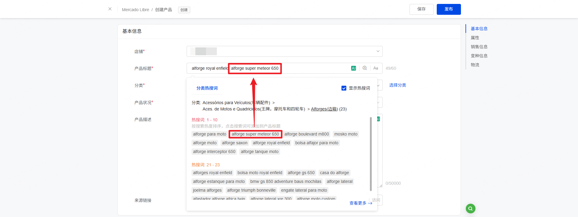 一、功能介绍 通过选择产品类目可快速查找热搜关键词,点击热搜词可直接引用到产品标题中,帮助优化标题从而增加产品曝光,提高订单转化率 二、操作步骤 第一步:进入【产品> Mercado> 草稿箱/发布失败】列表,创建新产品或编辑产品 第二步:选择产品分类后,在产品标题处点击可查看相关热搜词 注意:每级类目都可以点击查看相关的热搜词,且每级类目最多展示50个热搜词,分别按搜索量排序 (每天定时更新!) 第三步:选择相应分类下的热搜词,可以自动添加到产品标题内