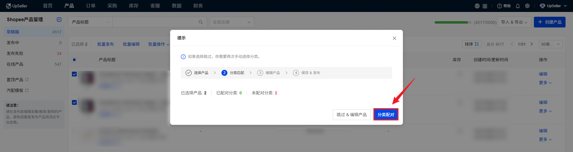 3. 点击“分类配对”对产品进行分类匹配,也可以选择“跳过&编辑产品”,直接进入批量编辑页面。如果选择跳过,需要在编辑页面手动选择类目