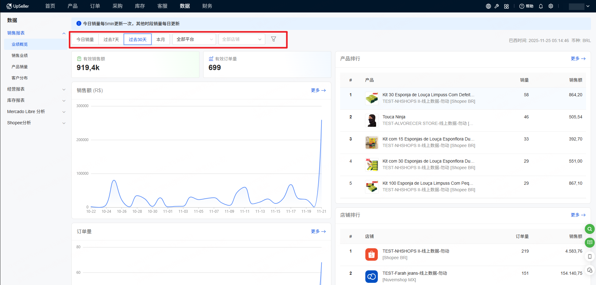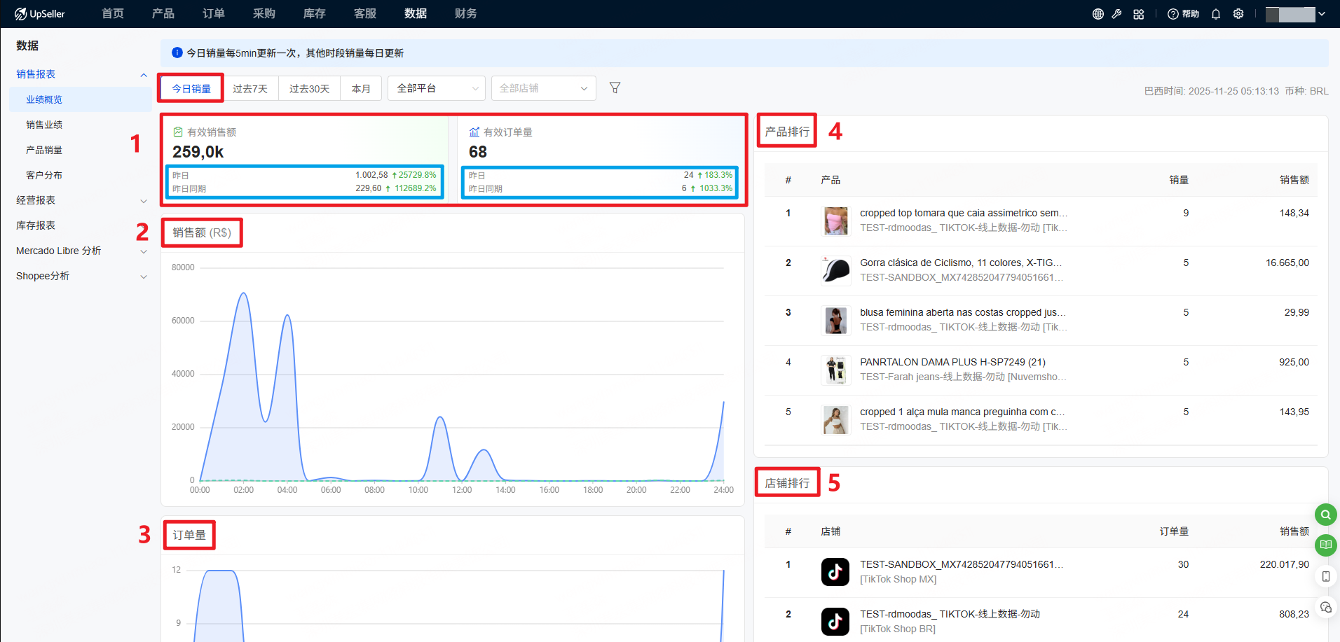 今日销量中的 有效销售额 及 有效订单量每 5min更新一次,销售额、订单量、产品及店铺排行每小时更新一次