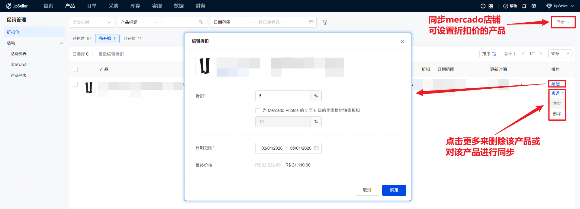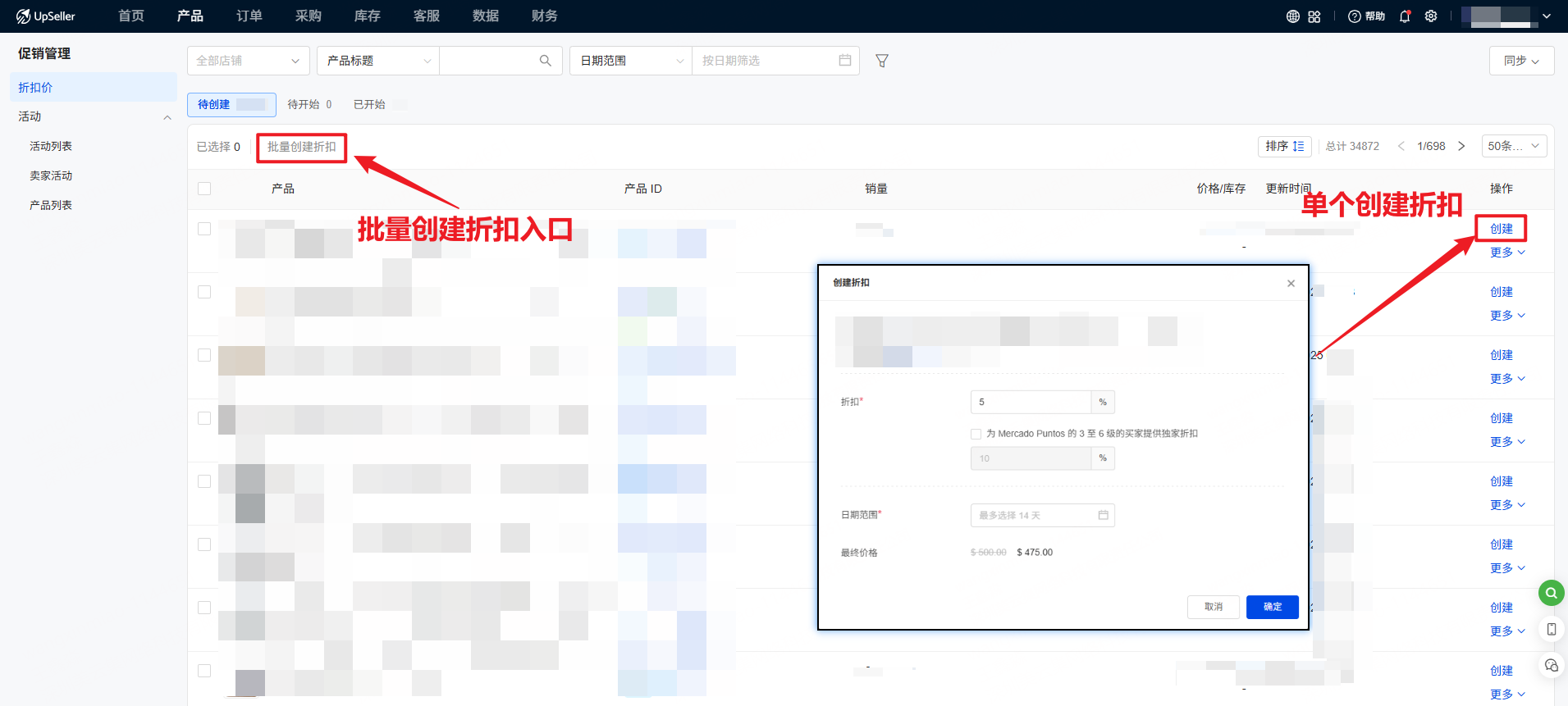 UpSeller支持批量创建Mercado店铺折扣活动,帮助增加店铺产品的曝光率,获得更多订单。二、参加促销条件