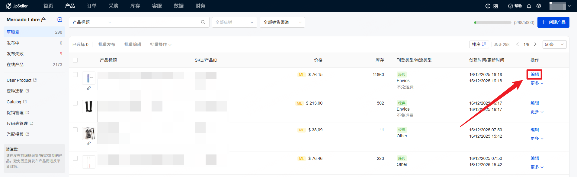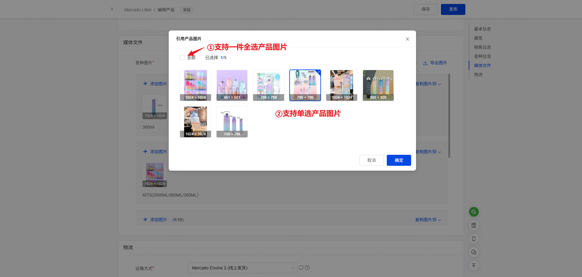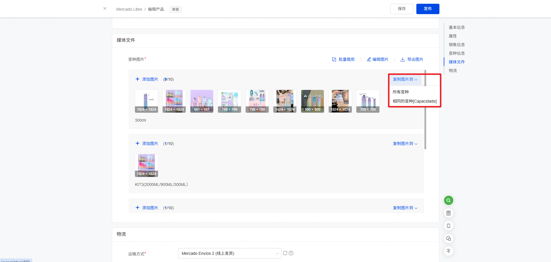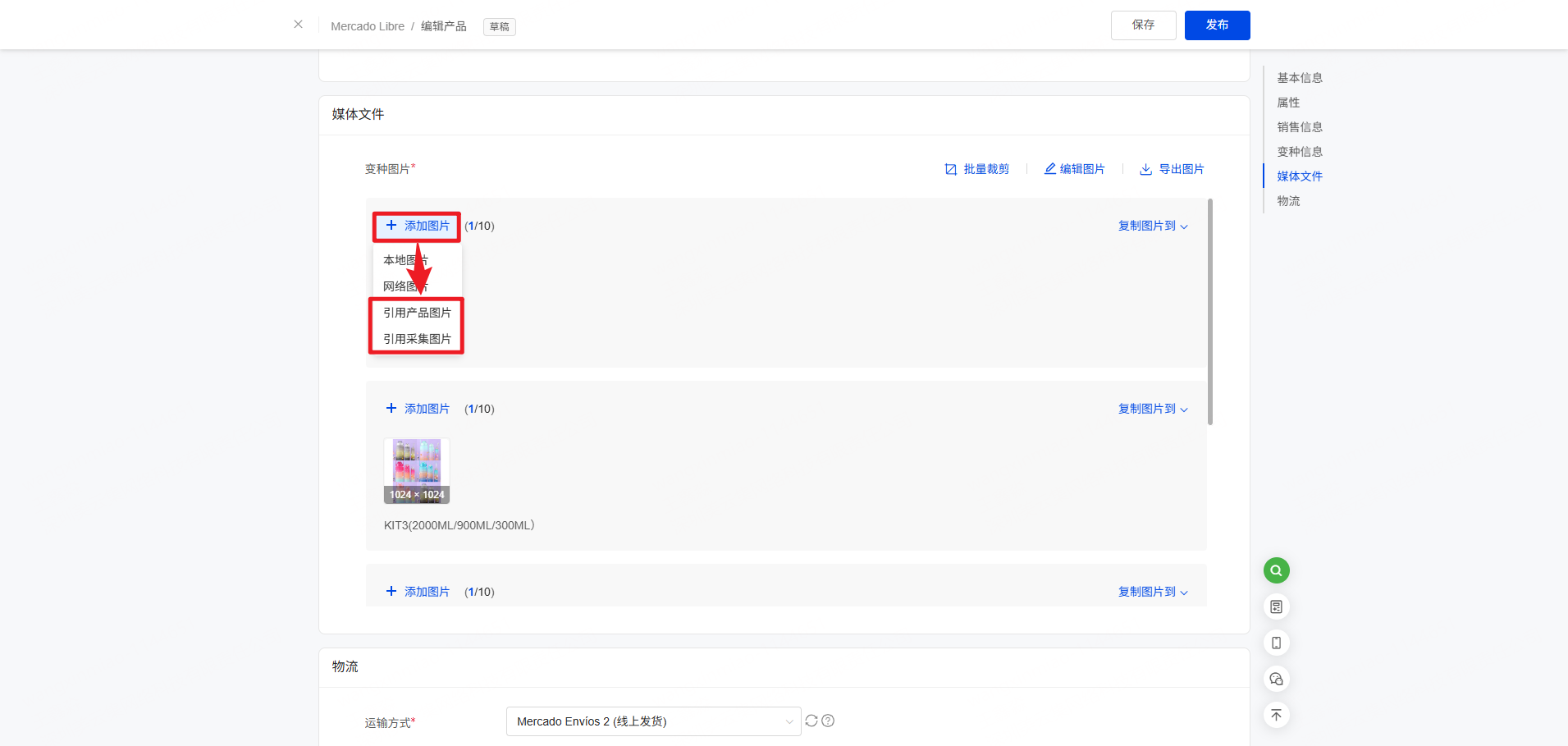第一步:多变种产品成功采集并认领到Mercado店铺后,需要进入Mercado草稿箱中编辑产品 第二步:若采集产品的平台、站点与当前店铺不同,需要进行分类匹配 第三步:在变种图片中,选择“添加图片”中的“引用产品图片”或“引用采集图片” 第三步:当一个变种引用完产品图片后,可以一键复制变种图片到“所有变种”或“相同变种”