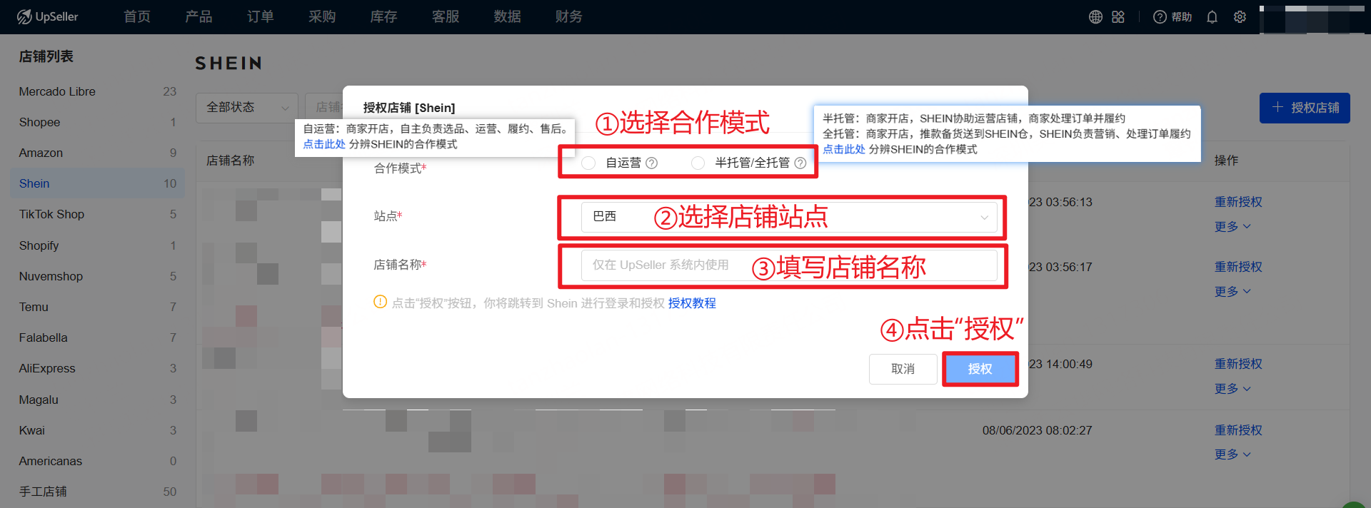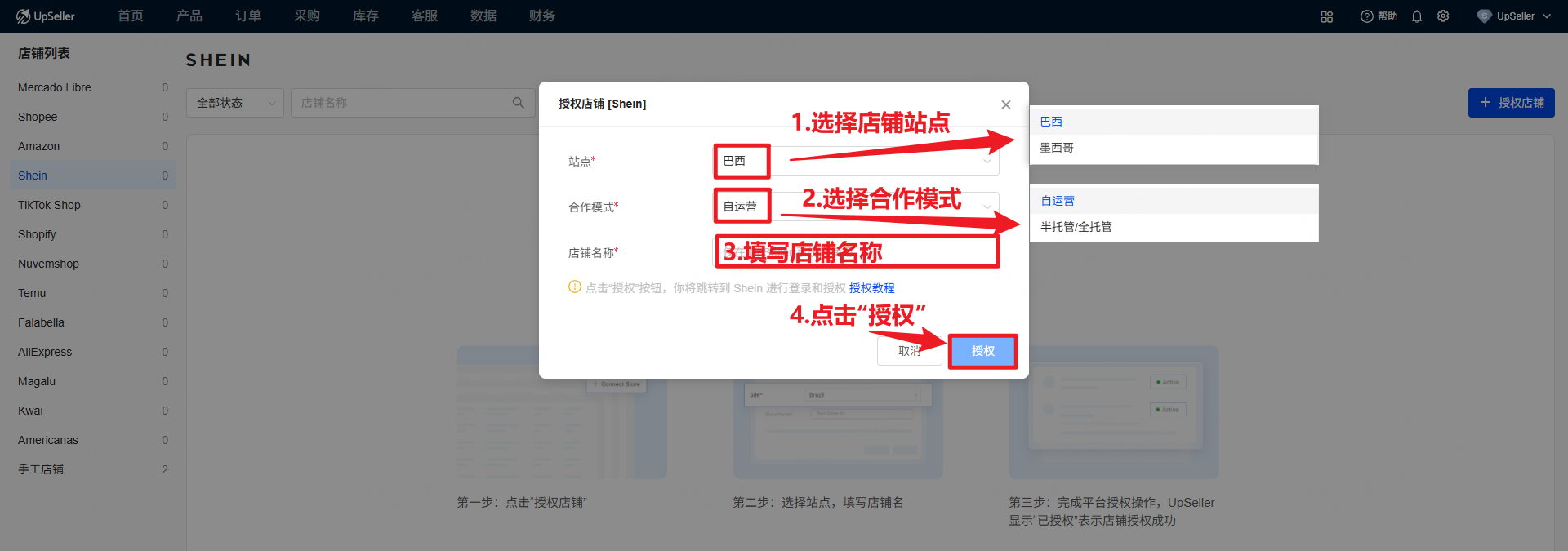 第一步: 点击“授权店铺”后,选择站点 >> 选择合作模式 >> 填写店铺名称 >> 点击 "授权"
