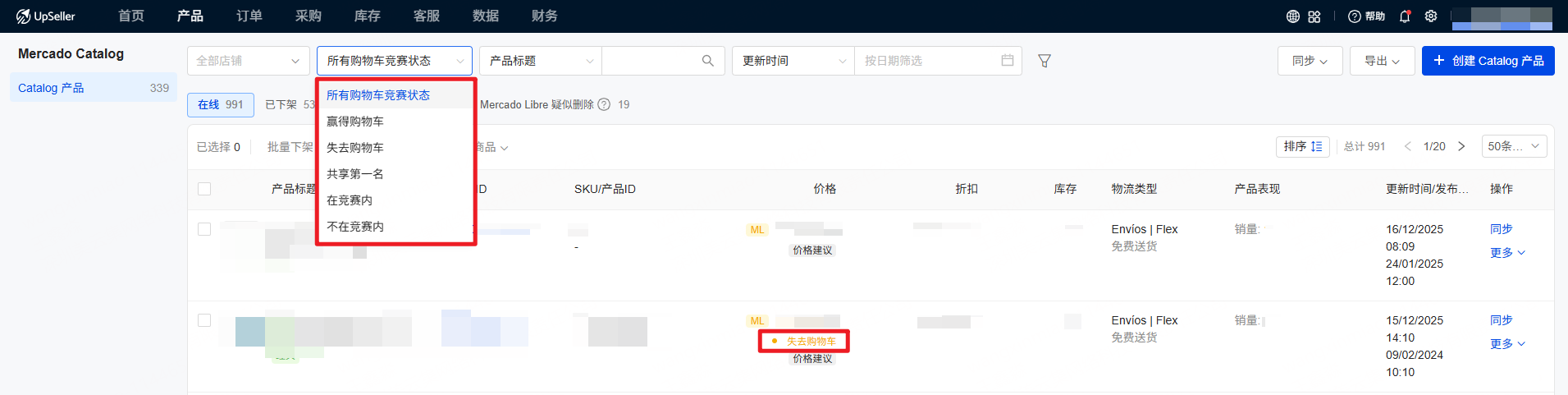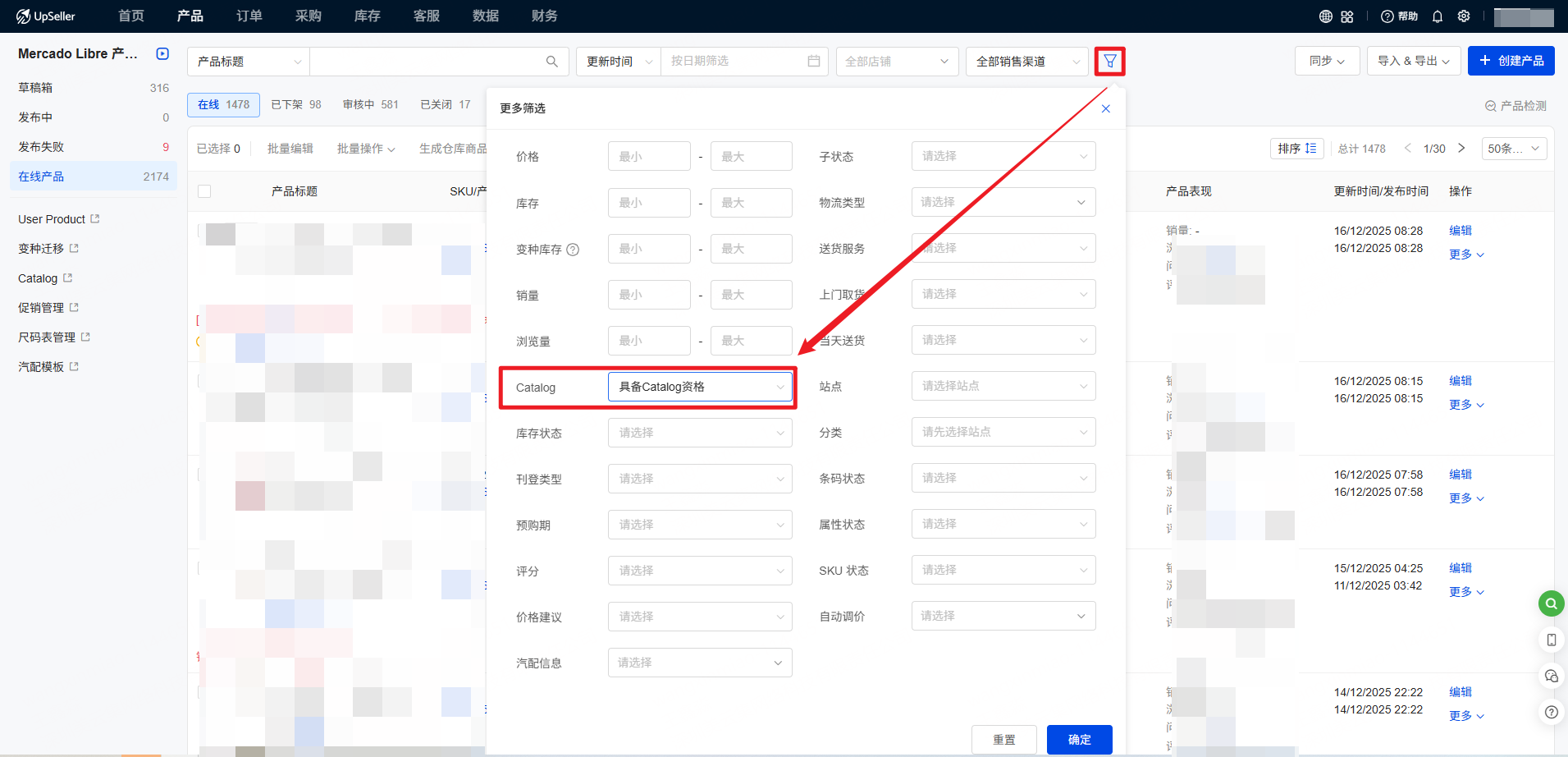 第一步:在 Mercado 在线产品列表高级筛选出具备 Catalog 资格的产品