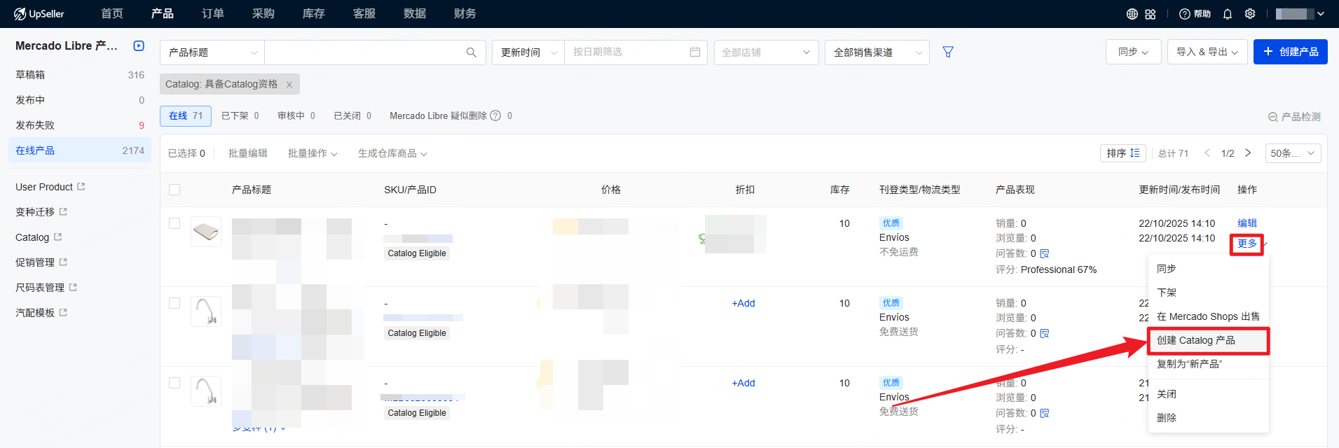 第二步:点击 更多 >> 创建 Catalog 产品 >> 需要确认该产品与 Mercado 平台建议的 Catalog 产品是否相同