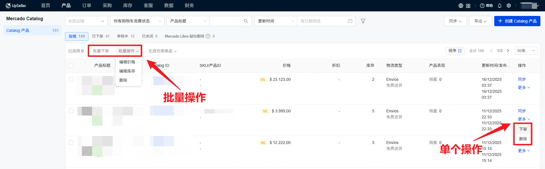 注意:删除 Catalog 仅在 Upseller 上删除,不会删除在 Mercado 平台上的 Catalog 产品,如果需要删除在平台的 Catalog 产品,需要先下架产品后再删除