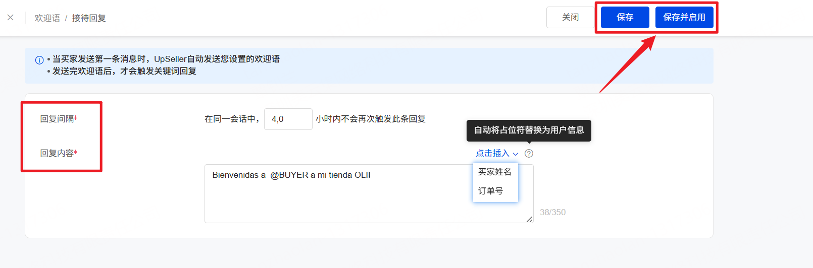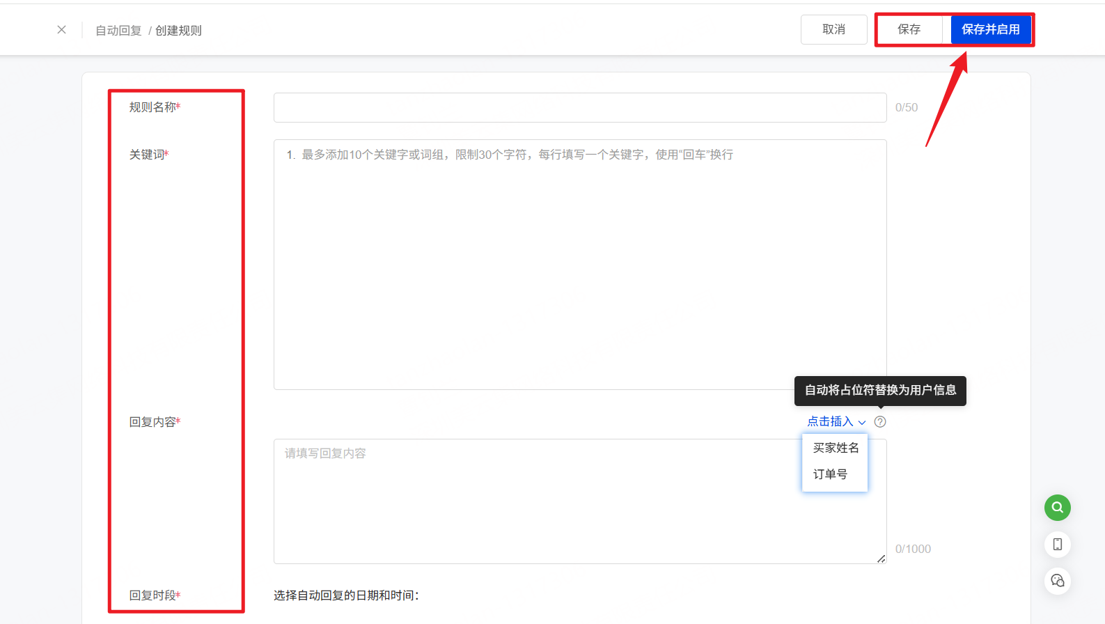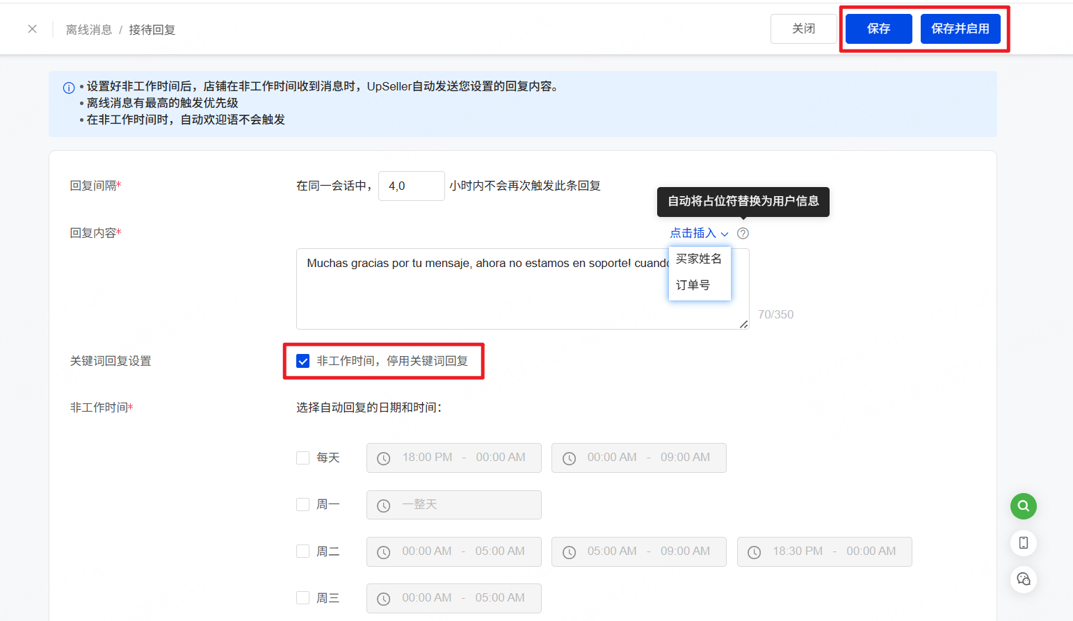完善“回复间隔/回复内容/非工作时间”>> 保存/保存并启用