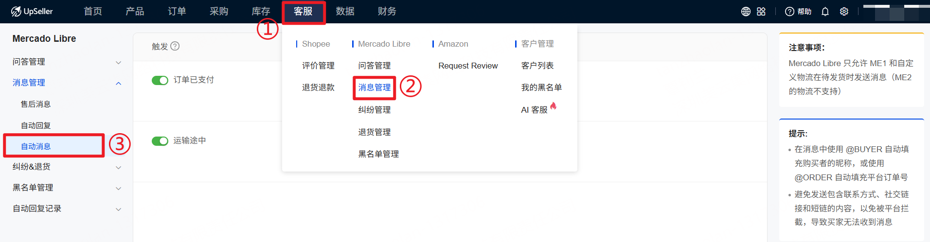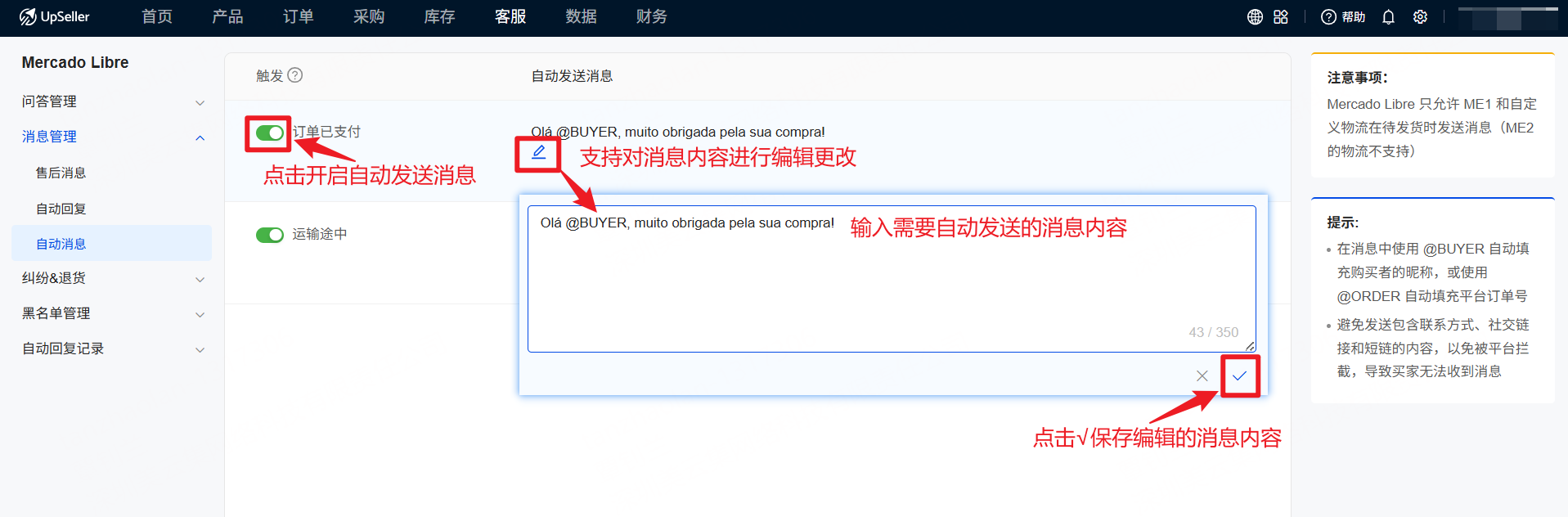 对于使用Mercado ME1和自定义物流的订单,UpSeller可自动发送消息给买家关于包裹的状态以及对买家感谢的话语等,提升买家购物体验