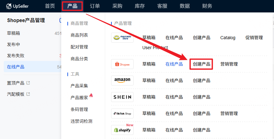 【产品】模块>> 选择Shopee平台>> 点击"创建产品"