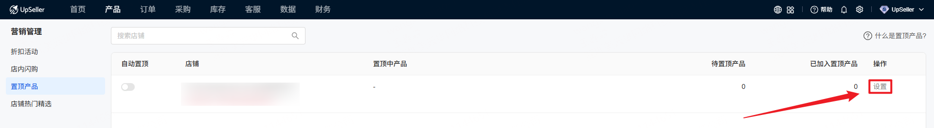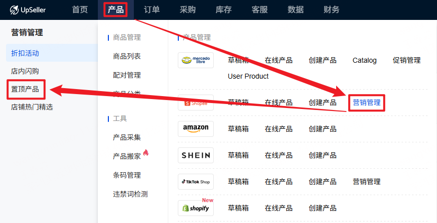 操作入口:点击【产品】模块 >> Shopee >> 营销管理 >> 置顶产品