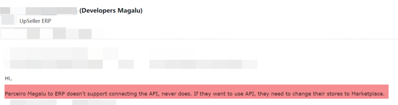 , Parceiro Magalu暂未开放API给任何ERP,Magalu平台官方回复如下图: