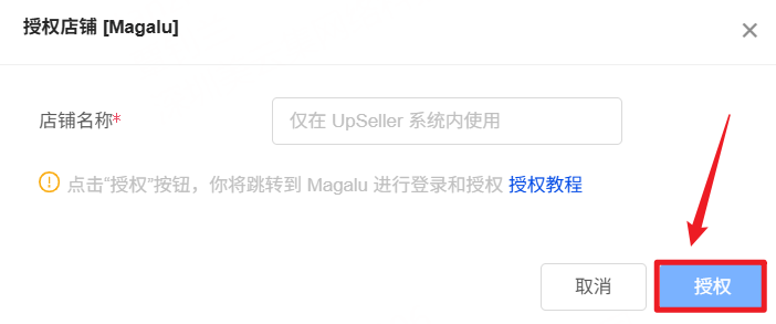 第二步:填写店铺昵称>> 点击 "授权" (注意:店铺昵称仅在UpSeller使用,无需与店铺真实名称保持一致)