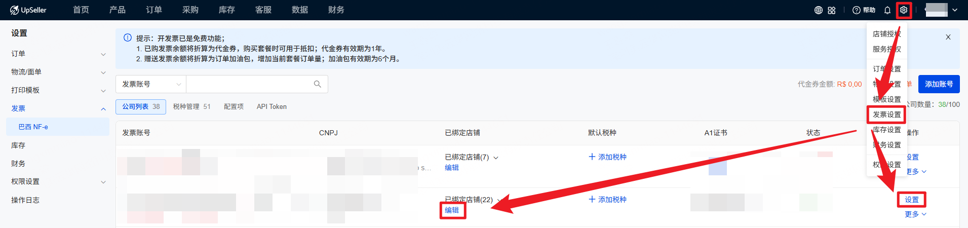 1、设置>>发票设置>>公司列表>>点击【编辑】或【设置】,进入【已绑定店铺】页面