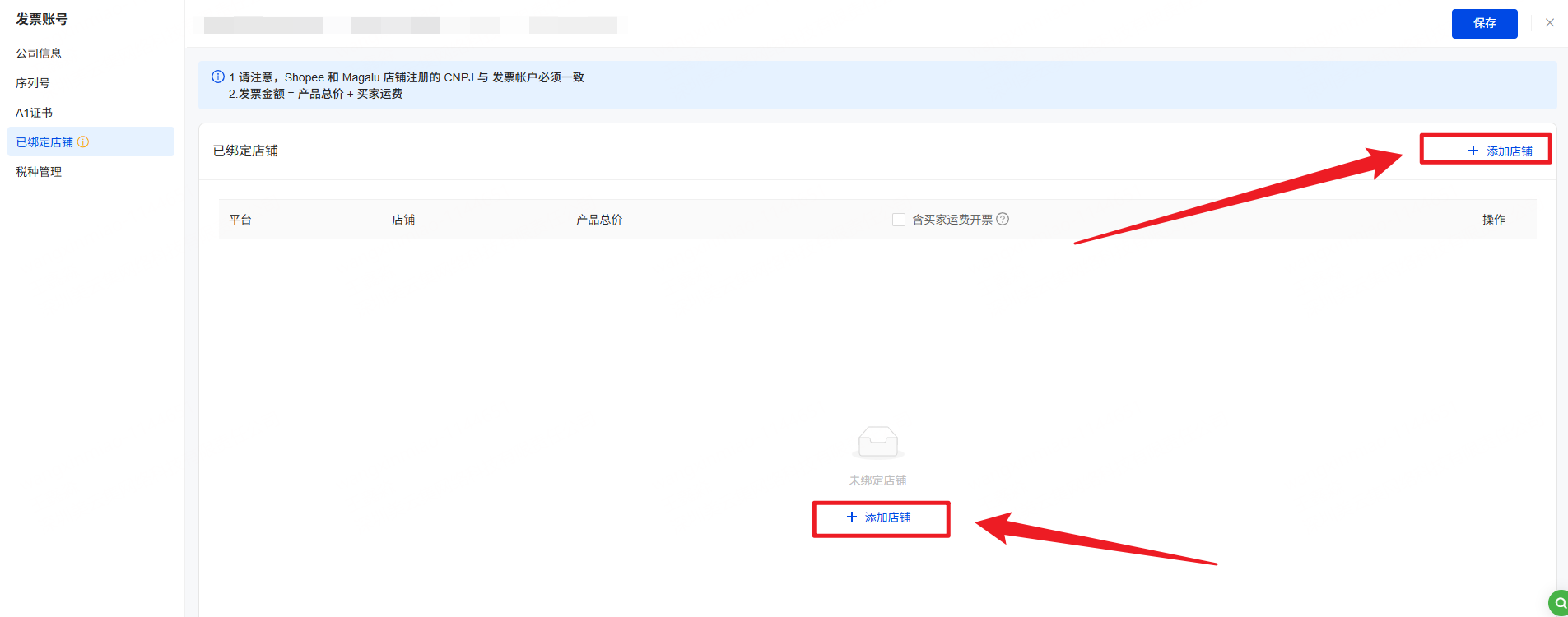2、展示该发票账号已绑定的店铺。若发票账号未绑定或想绑定更多店铺,请点击【+添加店铺】。