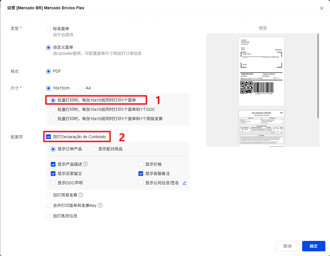 一、功能介绍 设置在打印面单的时候,同时打印DDC,帮助面单和DDC快速一一对应,提高订单处理效率。 二、操作步骤 点击 设置>>物流设置>>选择平台、站点,并对相应的物流进行“面单设置” 选择自定义面单,并按实际情况选择勾选加打DDC。勾选完成点击保存即可 DDC上想要加打公司信息或签名,请参考>>如何在巴西DDC上加打公司信息/签名?