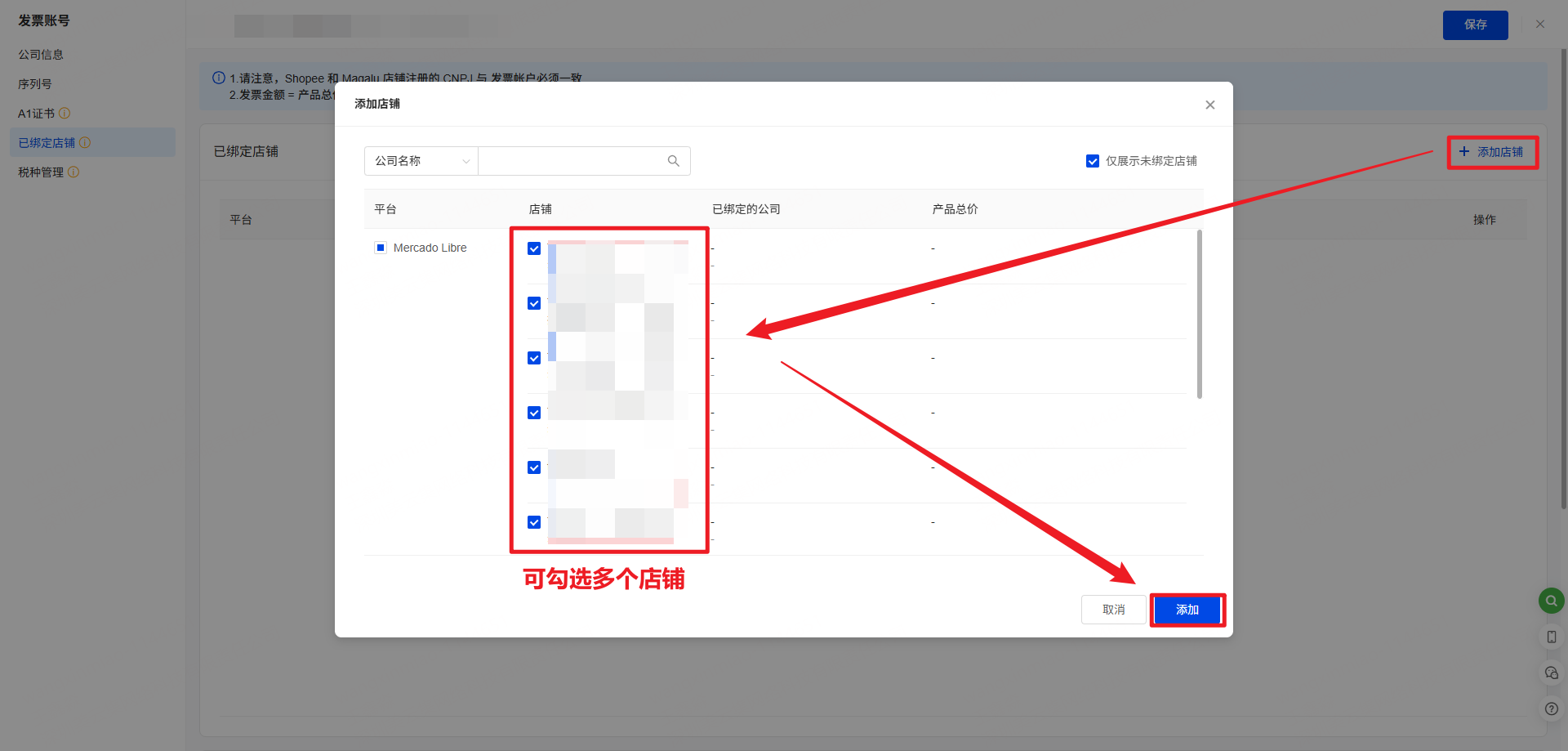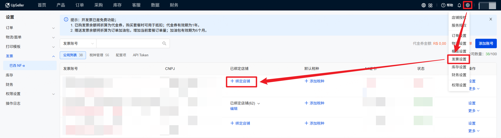一、功能介绍 UpSeller支持一个CNPJ绑定多个店铺(CNPJ相同的店铺),同时管理开票和设置发票金额。 二、操作步骤 1、点击设置>>发票设置>>巴西NF-e,找到对应的发票账号,点击“+绑定店铺”。 如已有店铺被绑定,将会展示已绑定店铺以及设置的平台佣金,点击绑定店铺进入绑定界面(如下图) 2、可直接绑定多个店铺(绑定之前,请确保该店铺已经在UpSeller完成授权)