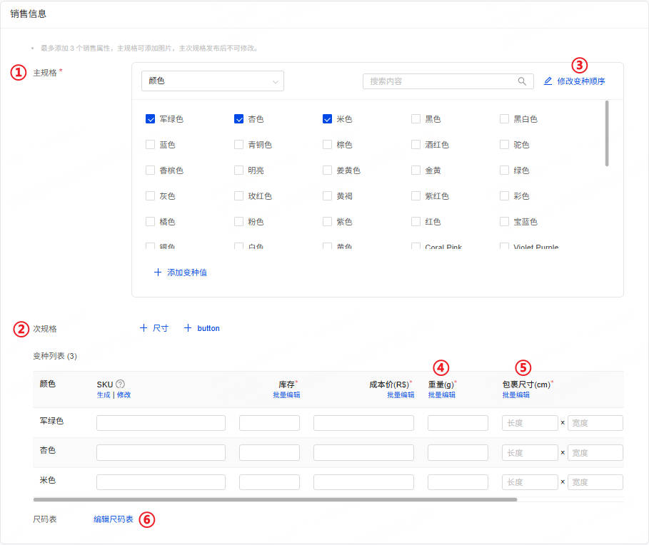 注意:带*为必填项, 最多添加 3 个销售属性,主次规格发布后不可修改