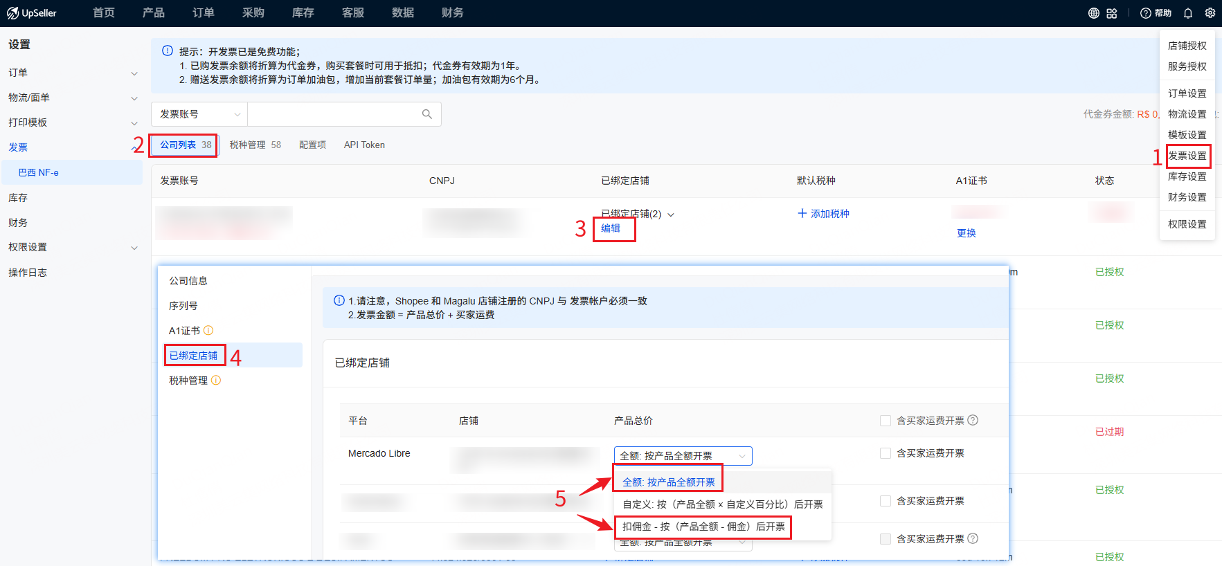 1、点击设置>>发票设置>>公司列表,找到报错对应的mercado livre店铺,点击“编辑”,将发票金额换成“全额-按产品全额开票(不要勾选含买家运费开票)”或“扣佣金-按(产品全额 -佣金)后开票”;