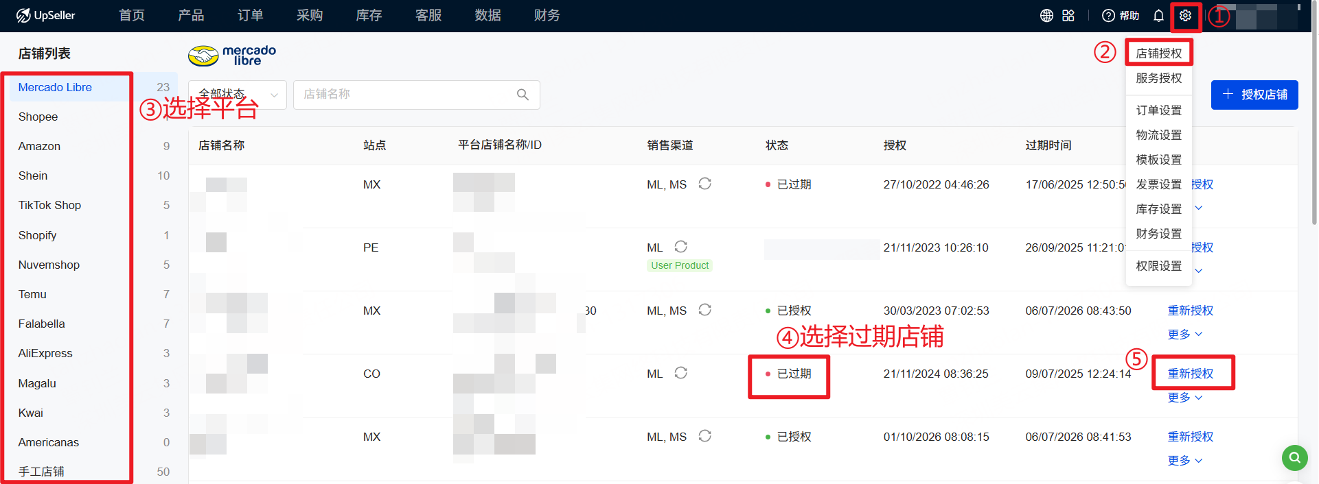 原因二:由于店铺账号信息变更或者在卖家中心取消了UpSeller ERP授权,也会导致店铺授权立即过期,则需要通过重新授权来解决二、注意事项