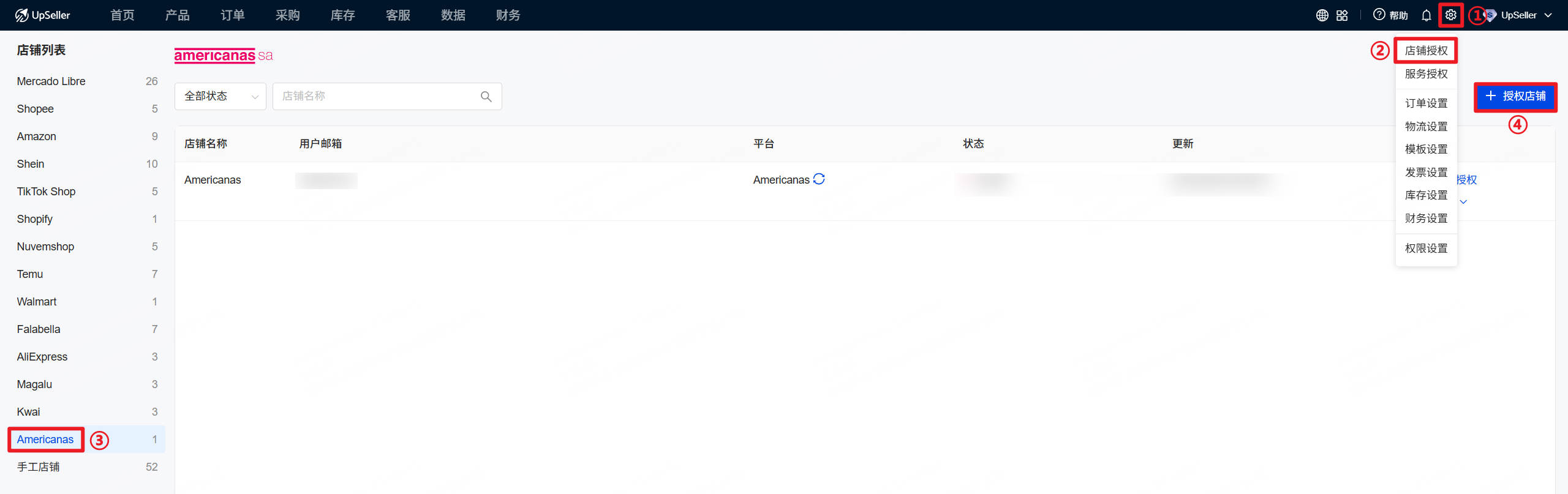点击设置>>店铺列表>>Americanas(B2W)平台>>授权店铺