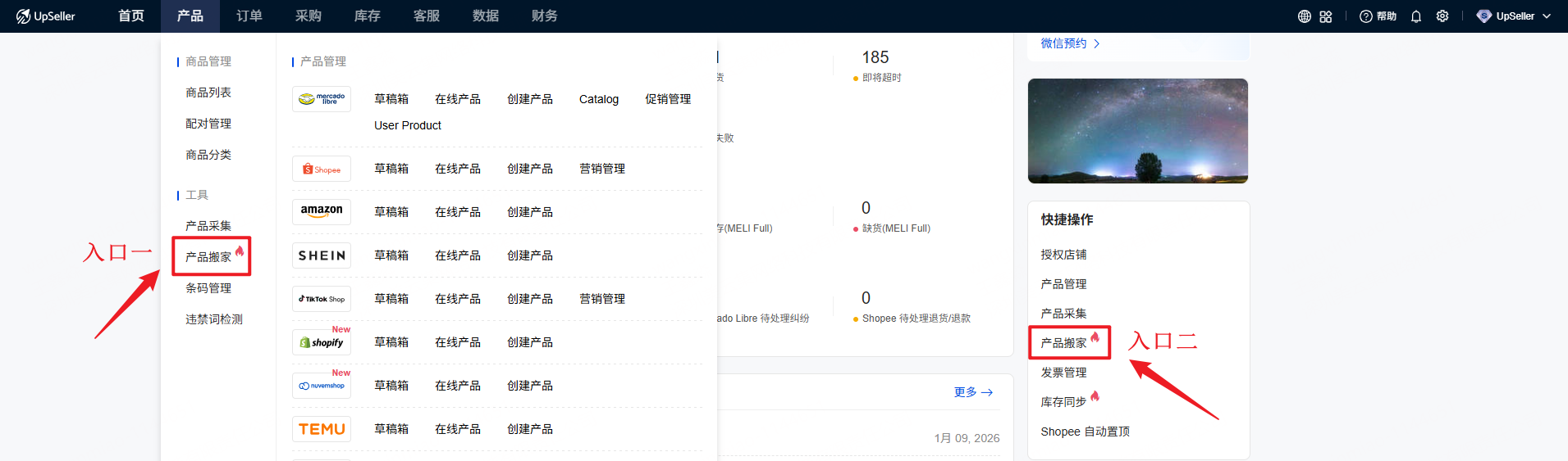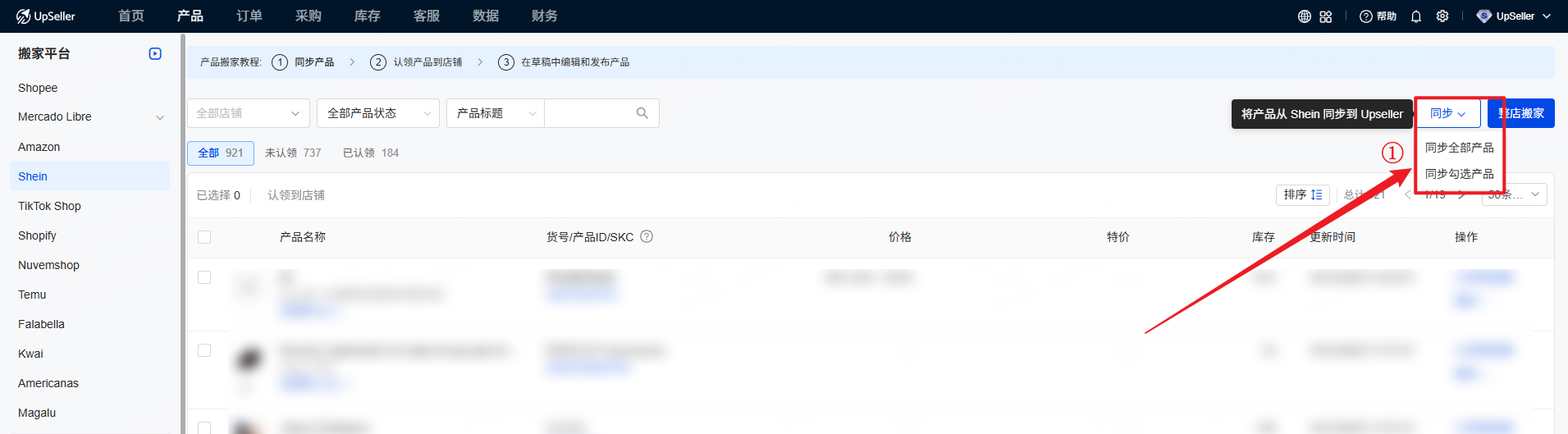 第一步:先选择搬家平台,再同步全部/勾选产品(将产品最新状态从平台同步到Upseller)