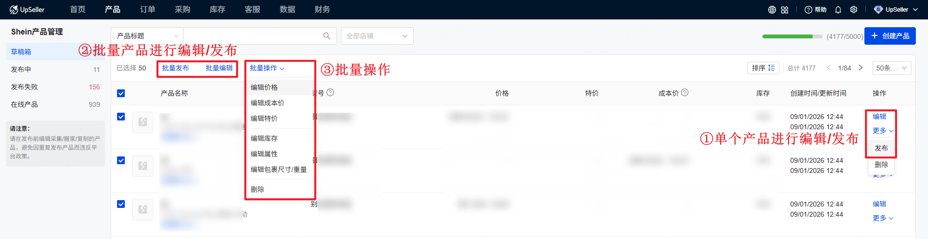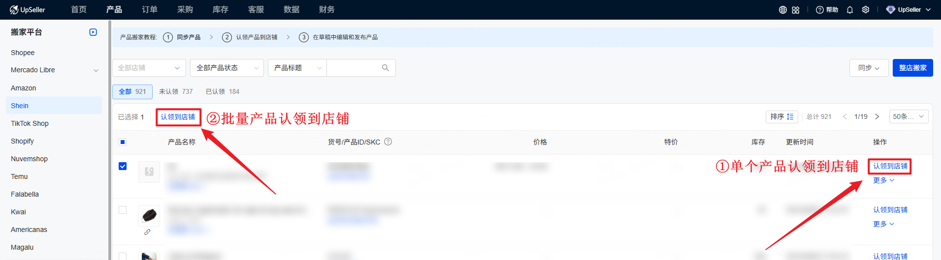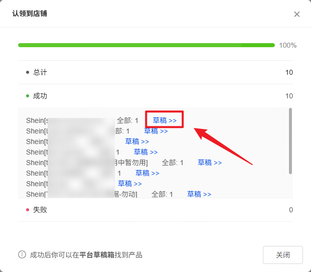 第二步:单个/批量产品认领到店铺,成功认领后,前往SHEIN平台草稿箱进行产品编辑,即可发布